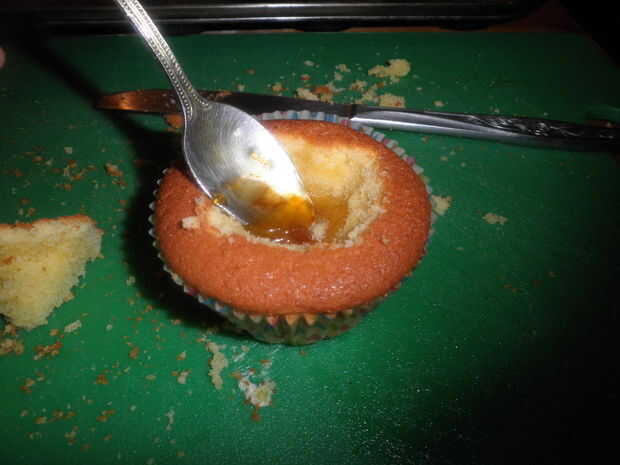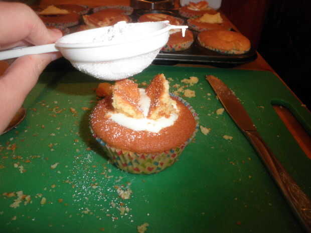 Ahora con un cuchillo con cuidado corte una forma de cono corto a la mitad de la parte superior (mirar foto) tomar esto y corte por la mitad por la mitad, poner media cucharadita de mermelada en el agujero de relleno en la parte superior con crema, entonces use el cono se corta por la mitad para hacer las alas (ver foto) y espolvorear con azúcar glas.