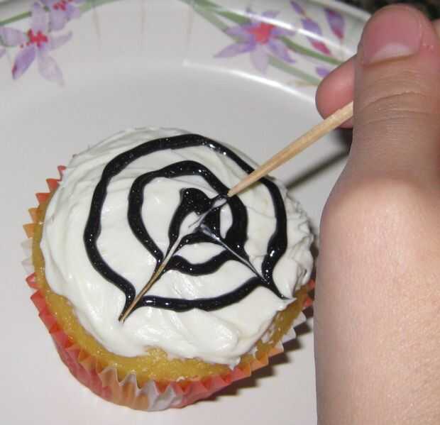 Utilizar el palillo de dientes para "arrastrar" a través de los anillos de Gel... Asegúrese de no ir demasiado profundo o se tire migas de Magdalena en su web de guinda!