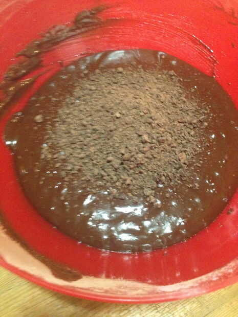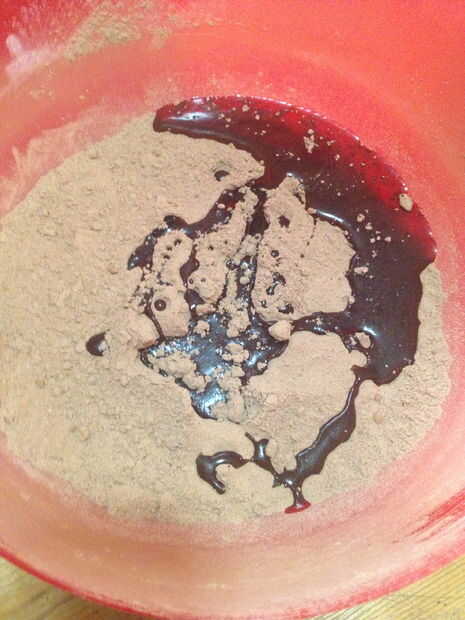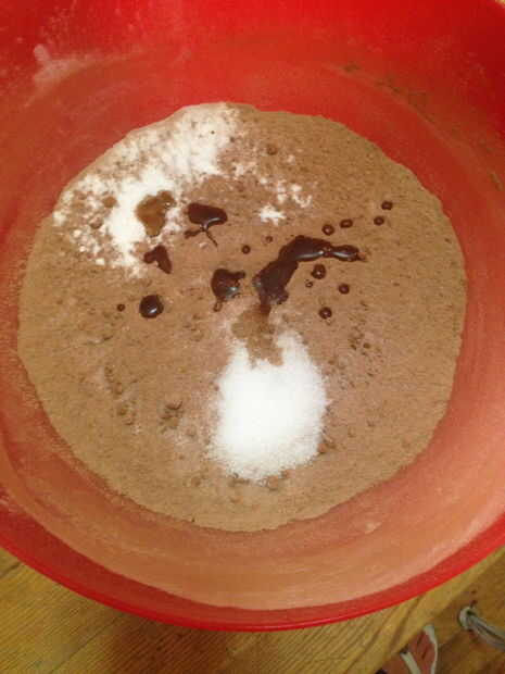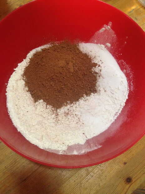 Batir en un bol grande la harina, el azúcar y el cacao corriente.