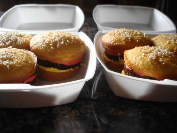 bollos de Magdalena y una empanada de brownie conforman estos cute little Cakes Slider! ¿Y la mejor parte? ¡ Son totalmente veganos! Cuan irónico!Inspiración:He visto un montón de recetas de cupcake de hamburguesa con queso en línea, pero ninguno de