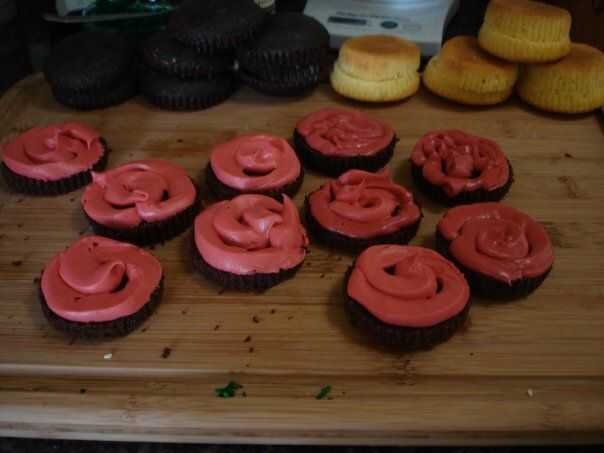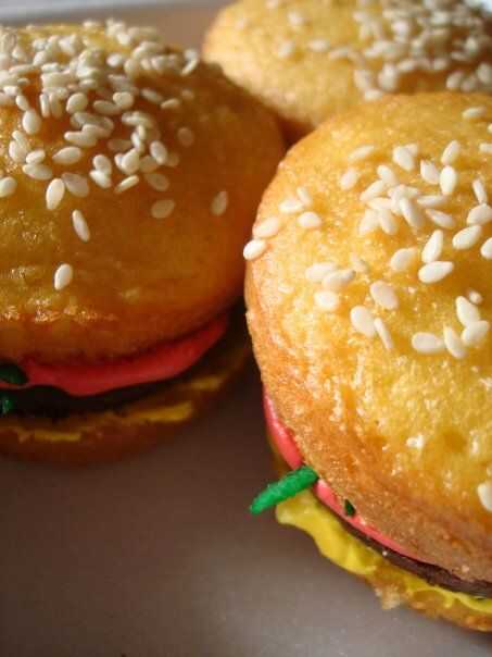 hice estos después de ver una torta de hamburguesa!Son súper fáciles, los niños pueden hacerlos!una cosa buena acerca de ellos es que no tienes que cocinar dos cupcakes para cada uno!Usted puede usar cualquier receta de pastel blanco llano pero esta