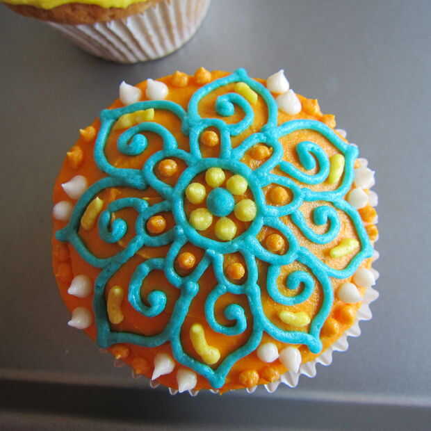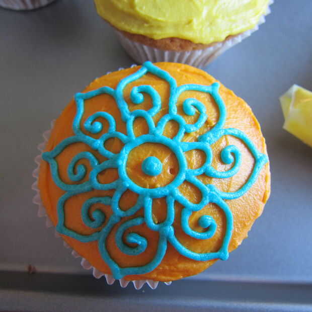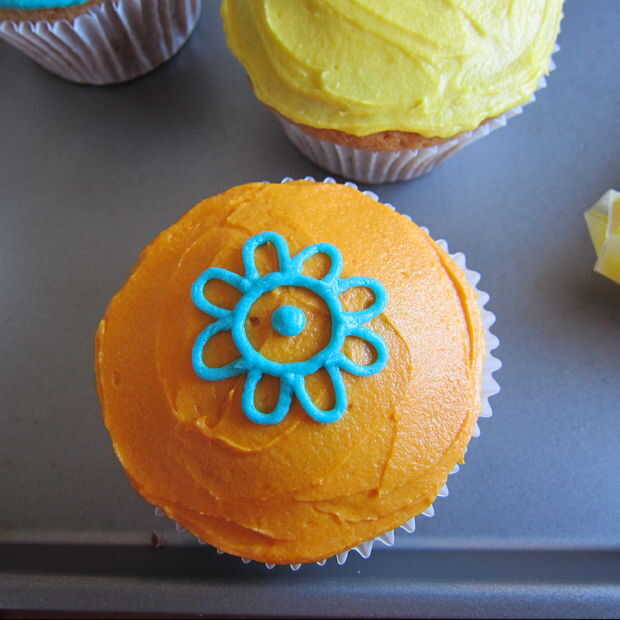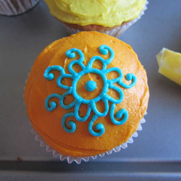 Cuando usted está haciendo líneas rectas con buttercream frosting Asegúrese de que el glaseado esté a temperatura ambiente para apretar la cubierta de la Manga pastelera fácil. Tratar de mantener presión uniforme en la Manga pastelera para conseguir una línea uniforme y recta. Presione suavemente con la punta en el extremo de una línea, en el Magdalena, para conseguir el glaseado se adhieren a la Magdalena y no rotura corta.