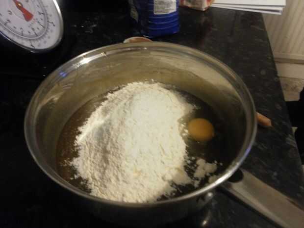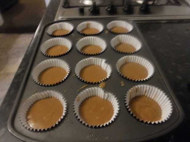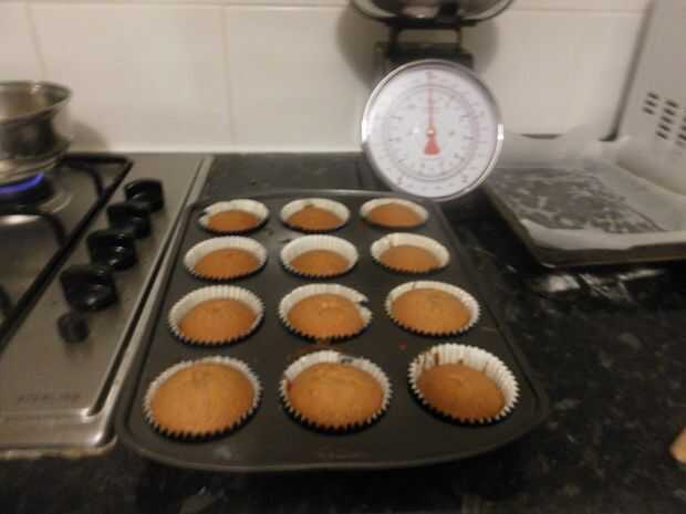 Cuando la mezcla de pastel se haya enfriado, tamizar la harina (no hago esto como mi seive ha desaparecido). Añadir el huevo y batir hasta combinar bien. Lugar en los casos de doce muffin y cocinar durante media hora. Si utilizas papel muffin casos, podría cocinan antes, así que cheque en luego de 20 minutos a partir. Cuando la Magdalena resortes si presiona ligeramente en él, entonces se realiza.