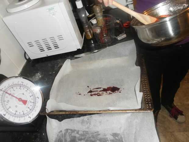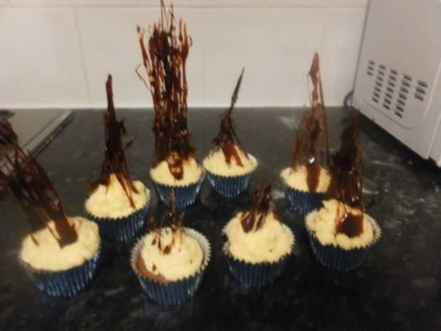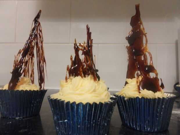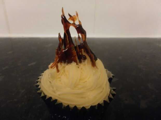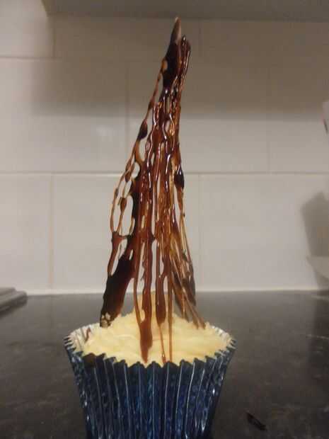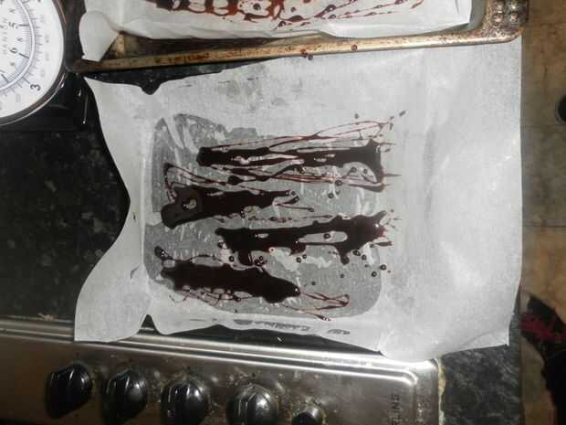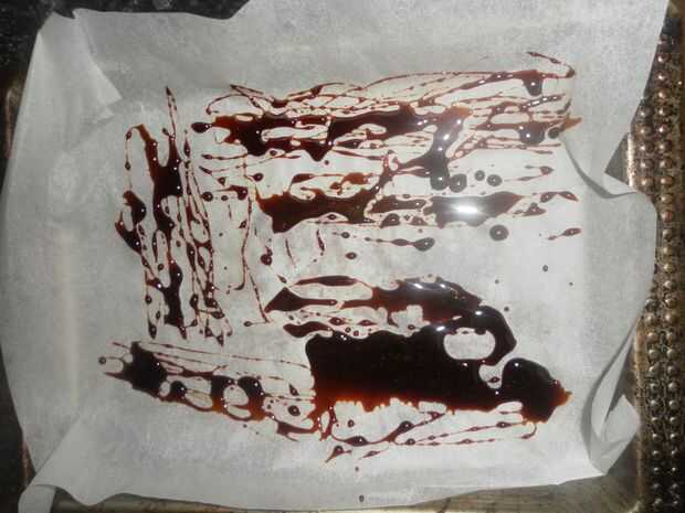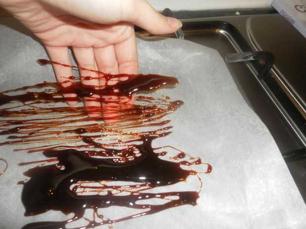 Cuando el caramelo sin burbujas en la olla, la llovizna en el papel pergamino usando la parte trasera de una cuchara. Tratar de hacer más finas rayas más gruesas gotas, como gotas gruesas son menos bonitos al final :( Cuando el caramelo haya alcanzado temperatura ambiente en el papel de pergamino (se tarda menos de diez minutos) desprenda suavemente y colóquelo en sus tortas. Dar un paso atrás y admirarlos.