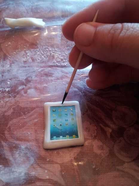 Moje un palillo de dientes en color negro de la comida y hacer un pequeño agujero/botón. Repita todos estos pasos para tantos cupcakes como usted necesita. Ahora sólo heladas sus magdalenas y rematar con su ipad comestible lindo.