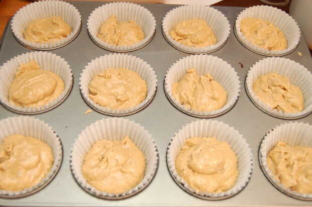 - Precalentar el horno a 160C y grasa y los casos de papel en la bandeja de la Magdalena/muffin. Crema a la mantequilla y el azúcar con una pizca de sal hasta que esponje y el color del café con leche.