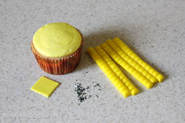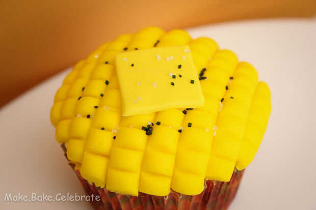 a hacer la mazorca de maíz, estirar fondant amarillo y rodar hacia fuera en bobinas de largo cerca de 1/4 pulgada ancho y unos 4 en largo. Utilizar un cuchillo y prensa líneas hasta hacer hileras de maíz. Montar la primera pipp un remolino plano de crema a la Magdalena y suave con toalla Viva. Entonces a partir en el medio colocar las tiras de maíz a la crema de mantequilla y recortar a cada lado. Luego añadir una cobertura de una plaza de "mantequilla" de pasta de azúcar y poco de "sal y pimienta" lijado azúcar para acabar con.