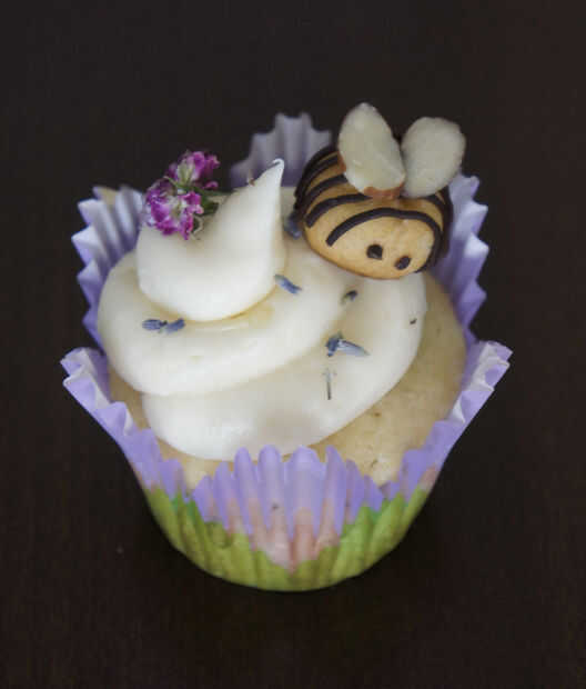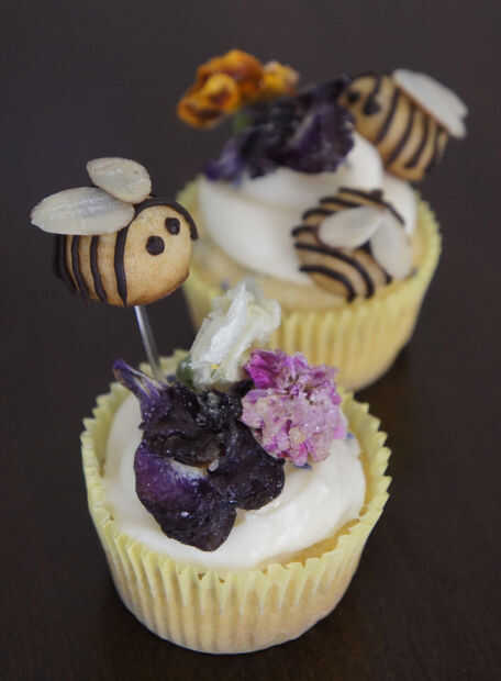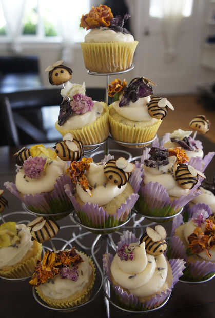 Cada cupcake es decorado con flores cristalizadas y hojaldre de crema abejas. Las abejas del soplo de crema también se llenan de crema de limón. Usted notará que algunas de las abejas suspenden por encima de los cupcakes, como si estuviera la tierra de las flores.