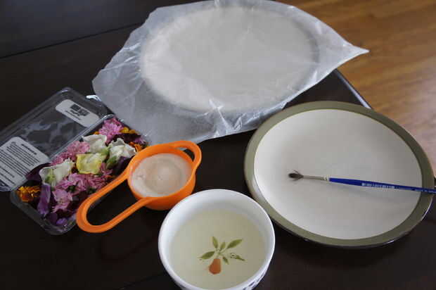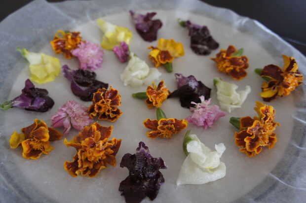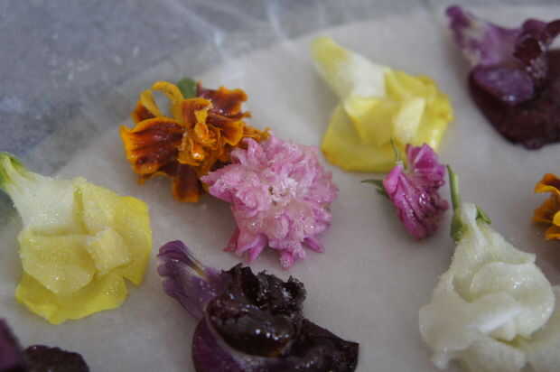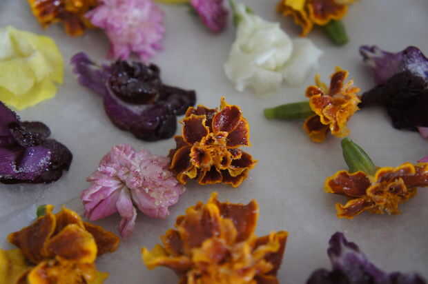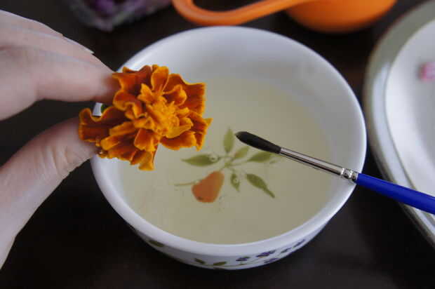 Se extienden las flores comestibles en un plato cubierto de papel de cera. Combine el agua y el huevo en un recipiente y batir ligeramente con un tenedor. Suavemente con el pincel pequeño, pintar una flor con la mezcla de clara de huevo. Mientras que todavía ha mojado, asperje suavemente la flor con el azúcar. Toque el tallo de la flor para que el azúcar suelto se cae. Coloque la flor cristalizada en el papel de cera para secar durante 12 a 24 horas.