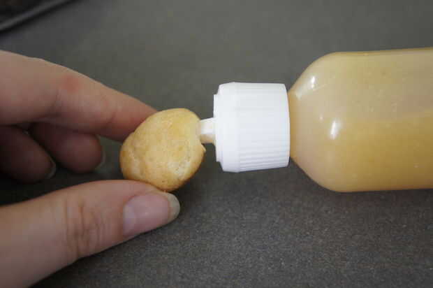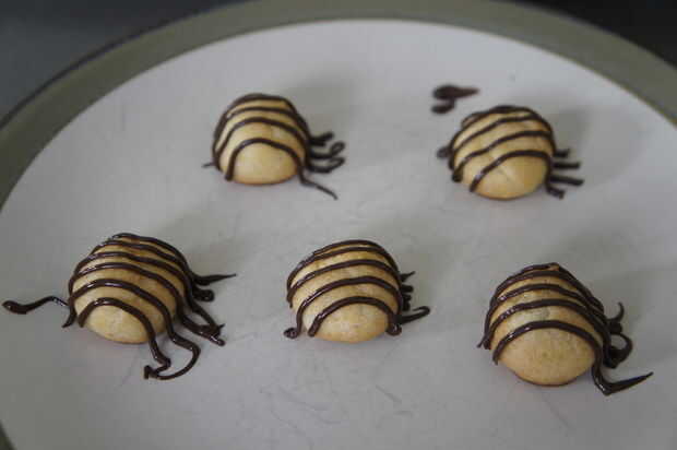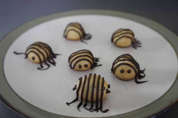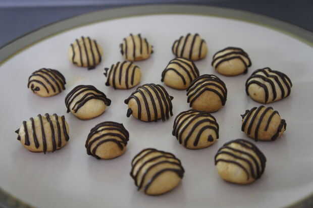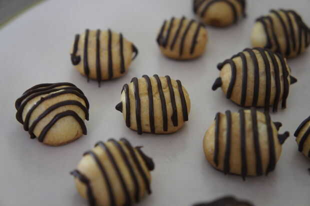 Una vez se han enfriado los soplos de crema, seleccionar los mejores y rellenarlos con crema de limón. Derretir algunos chocolate semiamargo y tubo rayas los soplos de crema. Usar el chocolate derretido para hacer puntos para los ojos y añadir un aguijón de la abeja hojaldre de crema.