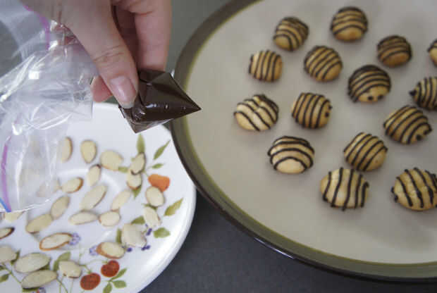 Para hacer las alas, usé almendras fileteadas. Verter un puñado de ellos en un plato y escoger los que mejor aspecto. Disponerlas en una placa en la pares. Tubo de chocolate encima de la abeja de hojaldre crema y añadir las alas, ligeramente superpuestos.