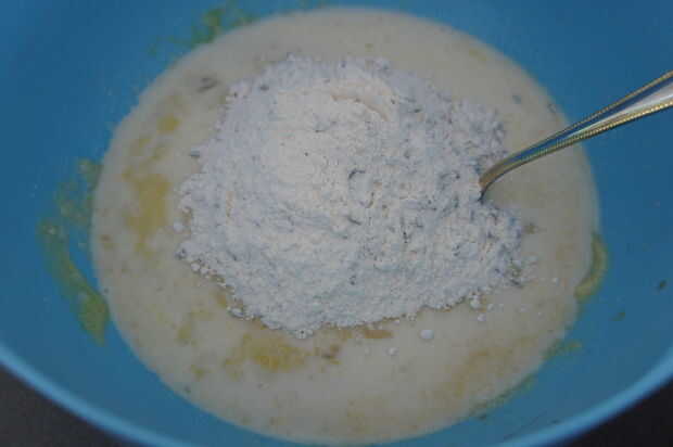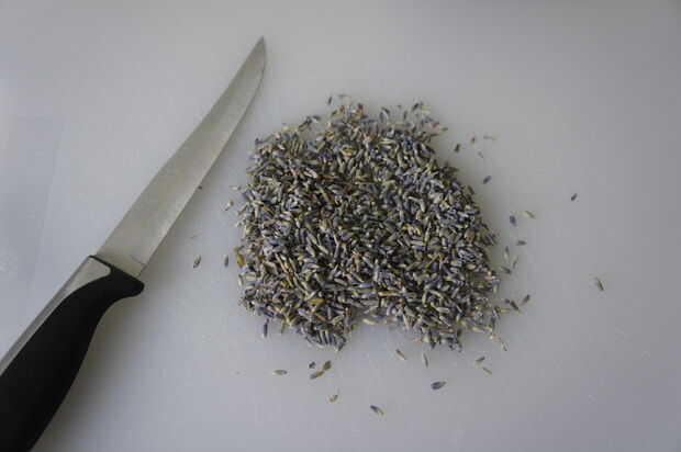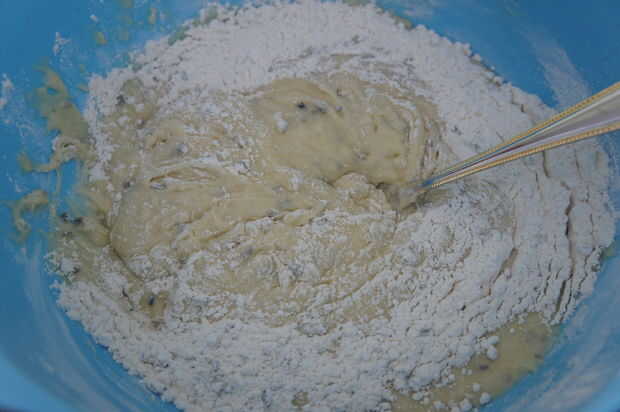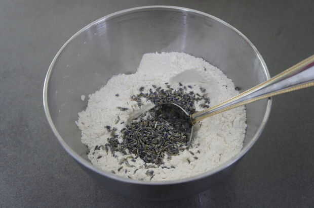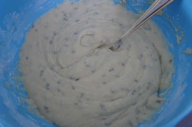 En un tazón mediano, Mezcle harina, polvo de hornear y la sal. Picar los brotes de lavanda y agregarlos a la mezcla. En un tazón grande, bata la mantequilla y el azúcar juntos hasta que esponje, unos tres minutos. Agregar los huevos uno a uno y batir de vainilla. Añadir la harina y la leche en adiciones alternativos.