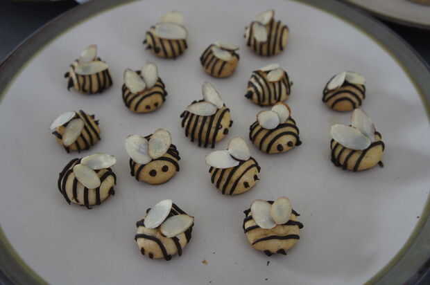 Elija una abeja y colóquela encima de la Magdalena. Tenga cuidado con la abeja que no desprender las alas o rayas de chocolate. Para algunas de las abejas, solía el pico claro para suspender la abeja sobre el Magdalena, como si viene a la tierra de las flores.