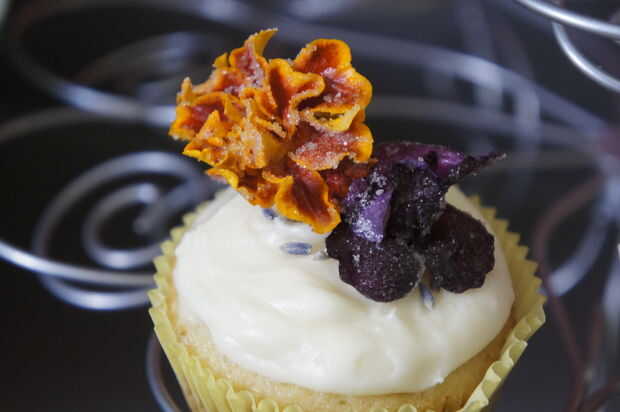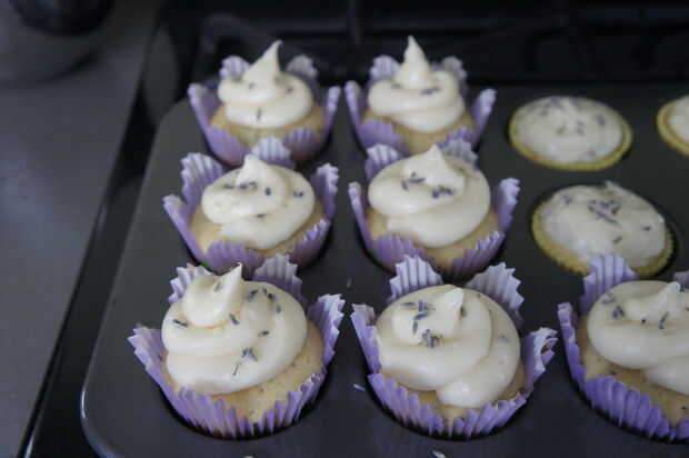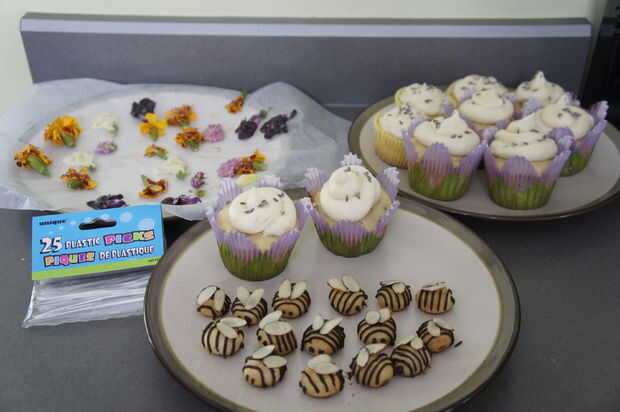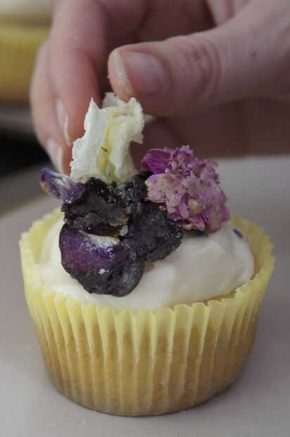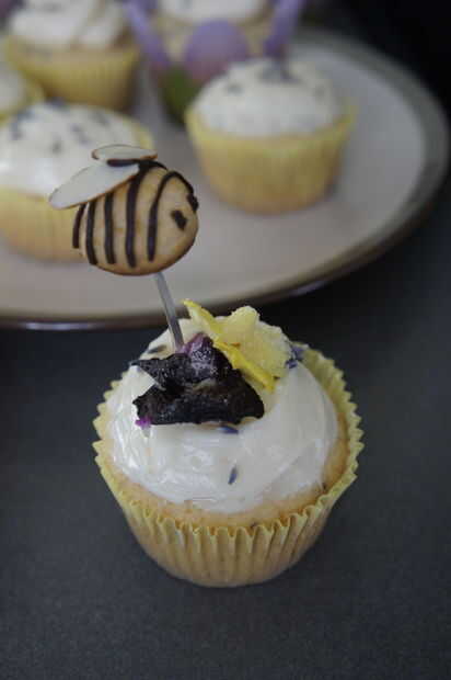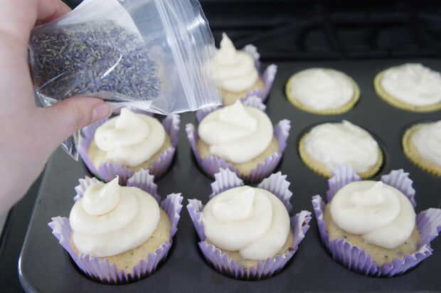 En este paso, se encargará de las flores y las abejas de hojaldre de crema en la parte superior de los cupcakes. En primer lugar, espolvorear algunos de la lavanda culinaria encima de cada cupcake. A continuación, seleccione unas flores que se complementan entre sí y colocarlos encima de un cupcake, empujando el vástago en el glaseado para mantenerlos en su lugar.