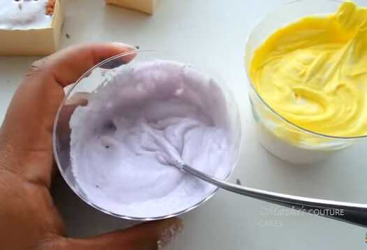 En un mezclador: crema de mantequilla por 3 minutos o hasta que esté suave. Gradualmente agregue el azúcar en polvo. Agregar sal y condimentos. Mezclar durante 5 minutos. Si es necesario agregar un chorrito de leche o crema. Opcional: Dividir el glaseado de color medio amarillo y lavanda de la mitad.