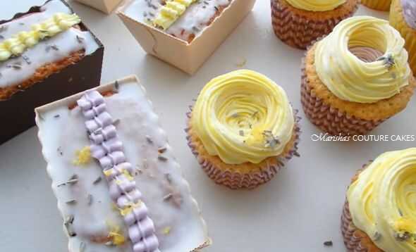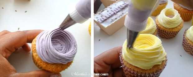 Dos bolsas de tuberías relleno con crema de mantequilla (uno amarillo, uno con lavanda y violeta) usando la punta #22. Comience en el centro de la Magdalena y la tubería en un círculo continuo hasta que casi haya alcanzado el borde. En lugar de parar, empezar a hacia arriba, dejando un espacio completo en el centro de la pipa. Acabado por guarnición un borde con ralladura de limón y lavanda.