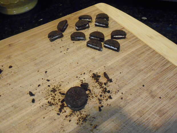 8 cortar cuatro grandes Oreo por la mitad (lugar dos de la mitad del lado) también, cortar unas mini de Oreo en medio