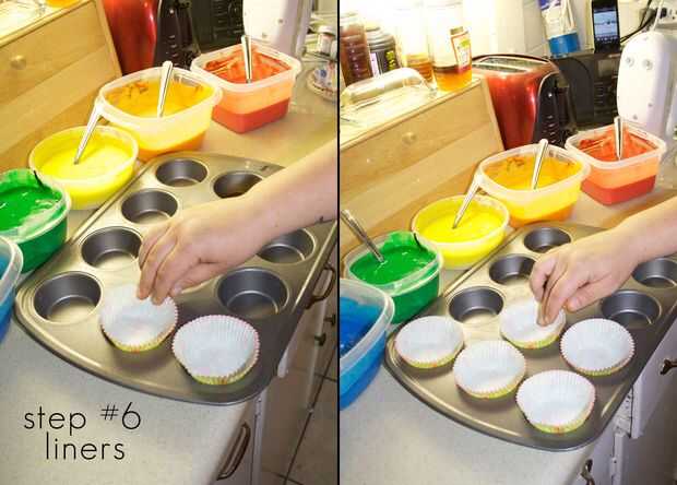3) separado la masa uniformemente (o tan uniformemente como sea posible) entre los 6 pequeños tazones de fuente