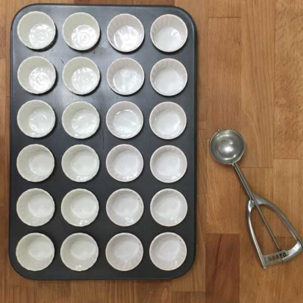 Una manera fácil para llenar tazas para hornear es utilizar una cucharada de helado. Utilice uno que mide 1/3 taza de la mezcla al llenar vasos de tamaño regular. Al llenar el mini tazas, use uno que mide la masa 2 cucharadas.