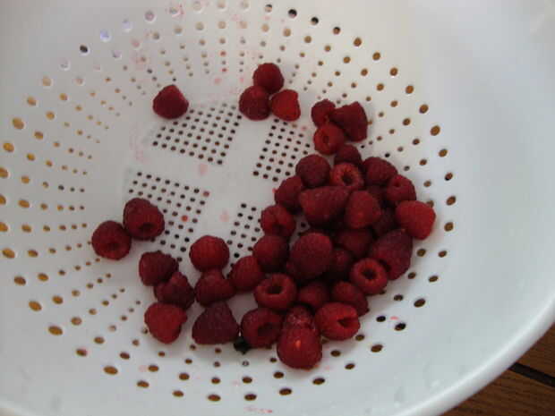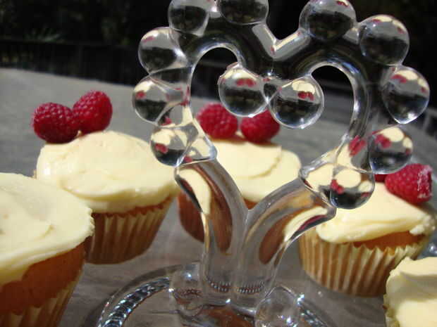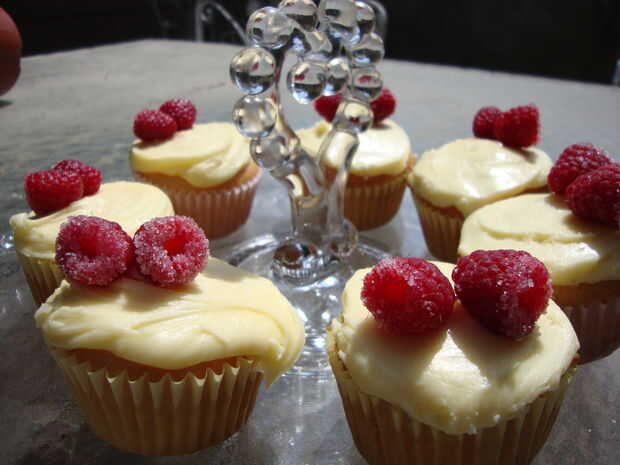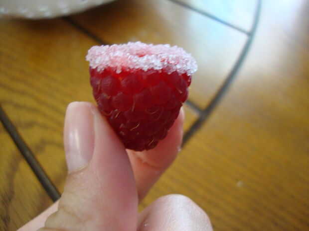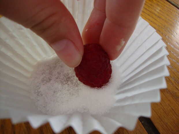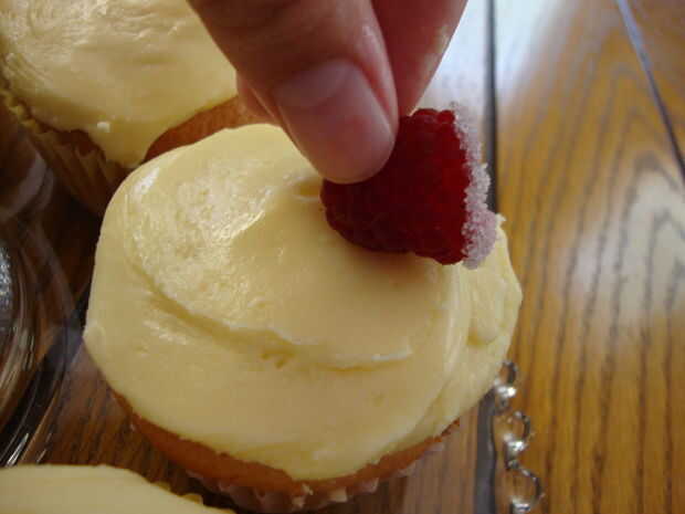 5. opcional: Sumergir las tapas de frambuesas en azúcar. Tan pronto como termine de helar una Magdalena, poner una frambuesa encima.