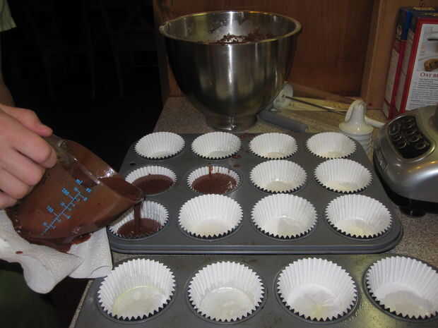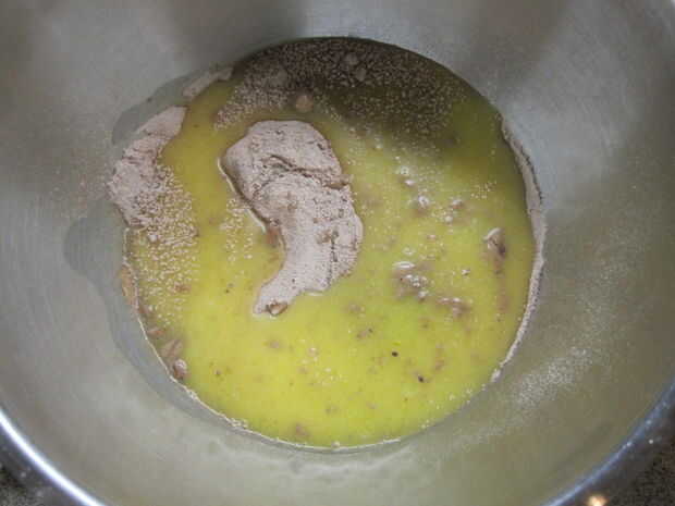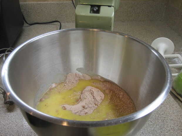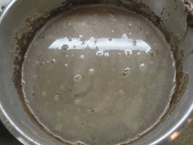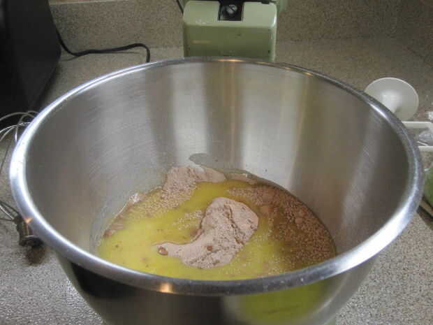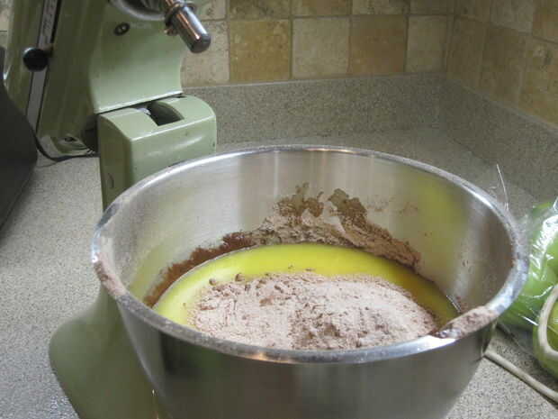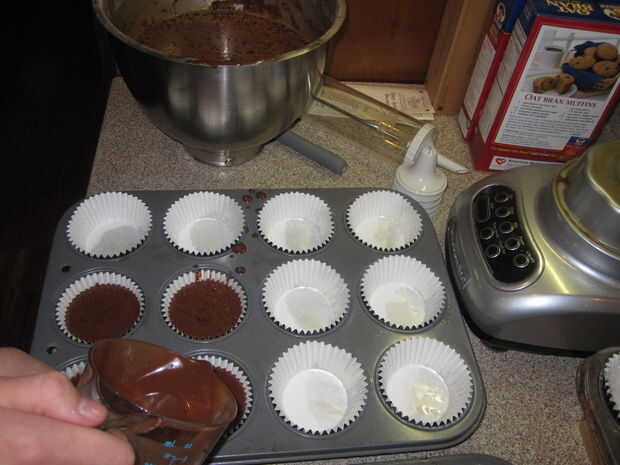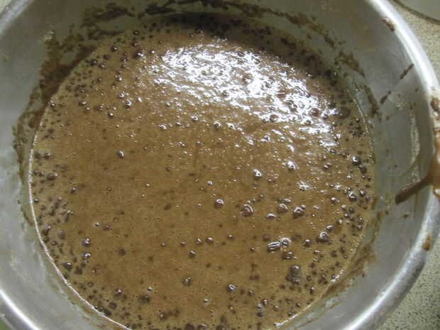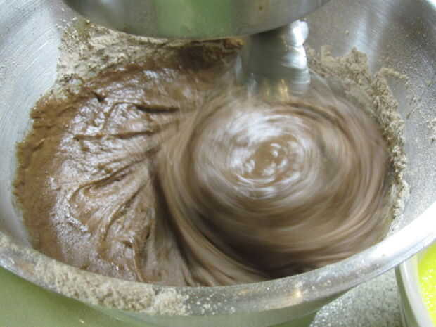 Combinar 1/3 de cada mezcla usando una espátula, alternando entre los dos hasta que quede suave añada 1/2 taza de agua caliente y revuelva hasta bien mezclado. Mezcla será muy delgada.