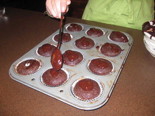 Combinar el chocolate, mantequilla, café caliente y jarabe de maíz en un microondas del tazón de fuente y el calor, 20 segundos hasta que el chocolate se derrita, revolver hasta que esté suave. Salpicar el frío, helado de malvavisco cupcakes con ganache tibia.