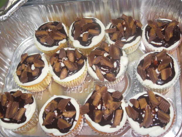 Cupcake de pastel amarillo, relleno con mantequilla de maní. Cubierto con vanilla frosting, jarabe de chocolate y picada Reeses tazas de mantequilla de maní.