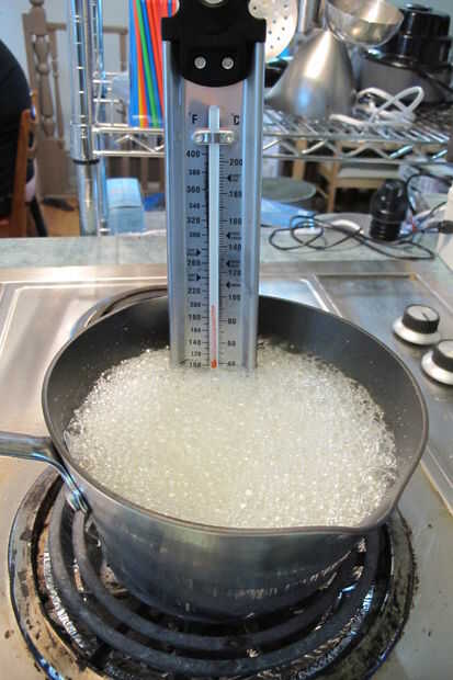 Añadir el agua y el azúcar a la olla. Clip en el termómetro de caramelo y deje hervir a fuego medio alto hasta el termómetro