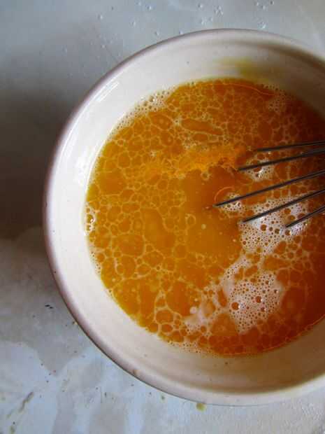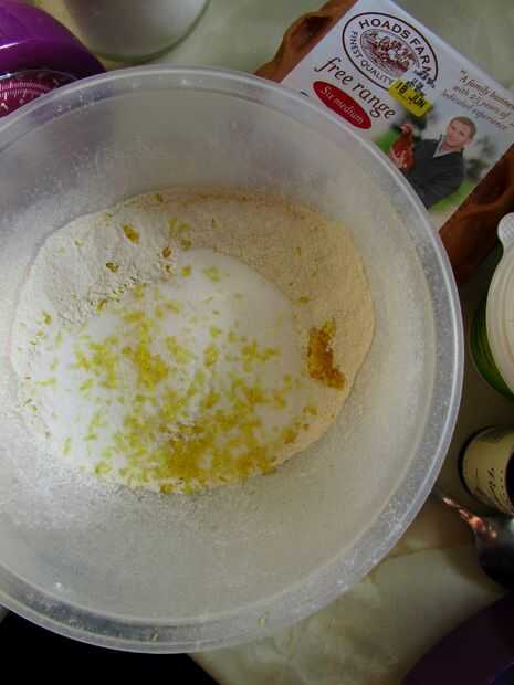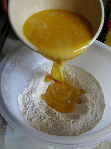 Poner el huevo, la yema de huevo, leche y la vainilla en un medio del tazón de fuente y vierten la mantequilla derretida. Mezclar y luego Vierta el líquido en la harina bien.