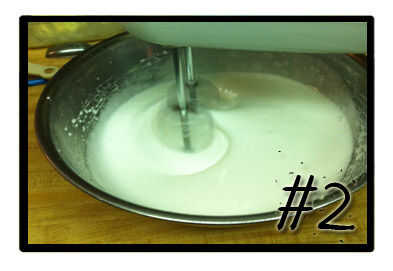 2. en un vaso grande o una taza de metal, batir las claras de huevo hasta que quede espumosa. Añadir el azúcar poco a poco y continuar a batir hasta que formen picos.