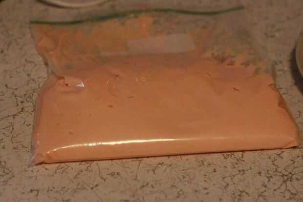 Combinan 1/2 bolsa de azúcar en polvo 1/2 taza margarina y 1/4 taza de agua. Añadir el extracto de naranja 1 cucharadita y 1/2 paquete naranja kool-aid. Mezclar bien y seguir agregando azúcar impalpable, una pequeña cantidad en un momento hasta que sea fácil de untar. Puede que necesite añadir un poco más agua hasta que quede la consistencia correcta.  Colocar el glaseado en una bolsa de congelador de Ziploc de tamaño galón.