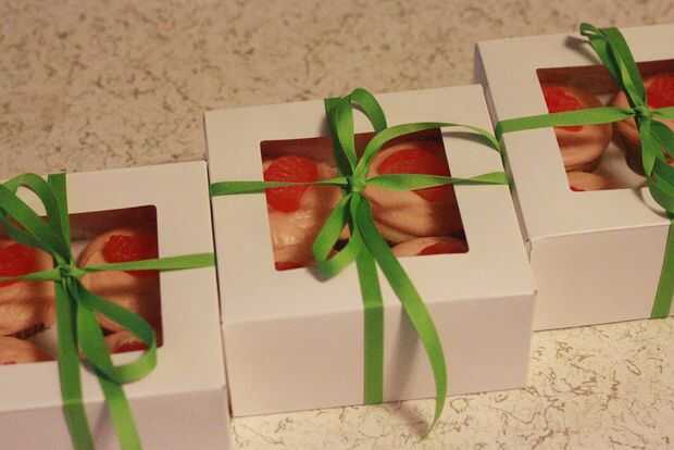 Una de las esquinas de la parte inferior cortar la bolsa del congelador. Heladas las magdalenas y cubrir con un rodaja de naranja caramelo. Si usted está haciendo estos cupcakes para regalar, comprar un paquete de cajas de cupcake de marca Wilton. Atar una cinta alrededor de cada caja y tienes un hermoso regalo!