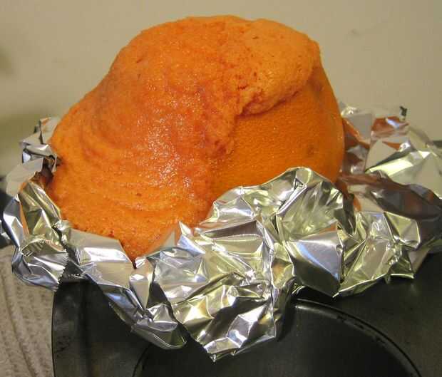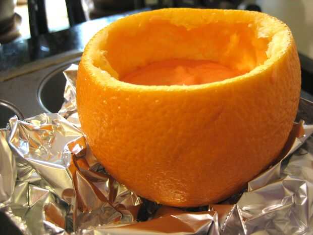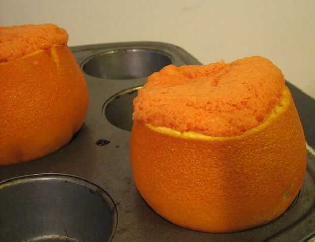 1. Rellenar las cortezas de naranja preparadas sobre 1/2 lleno de masa (la lámina ayuda a atrapar cualquier posibles explosiones de torta desde si les llena muy completo (como hice yo), podrían poof de la naranja y derrame sobre)