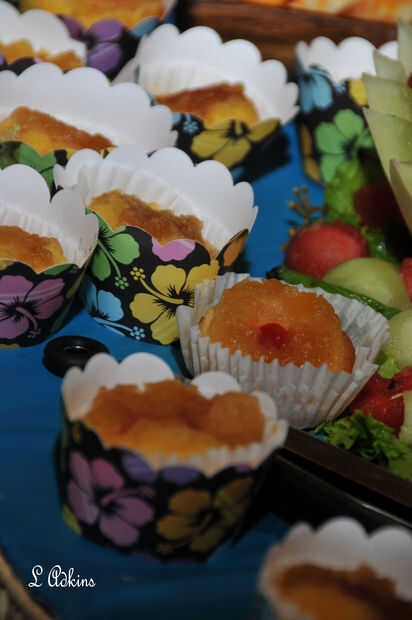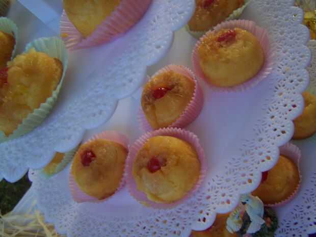 Coloque una rejilla en el centro del horno y precalentar a 350F. Ligeramente la niebla 24 tazas cupcake con aceite vegetal en spray. Apartar la sartén. Preparar el relleno: Mida exactamente 1 cucharadita de mantequilla derretida en cada taza de Magdalena. Espolvoree 1 cucharadita de azúcar morena sobre la mantequilla. 1 cucharada de piña escurrida encima el azúcar moreno se separó. Coloque media cereza en el centro de la piña. Apartar la sartén. A continuación preparar la pasta. Colocar la mezcla para pastel, crema agria, jugo de piña, aceite, huevos y vainilla en un tazón grande. Mezclar 30 segundos. Parar la máquina y rebañe las paredes. Aumentar la velocidad y mezclar 2 minutos más. La mezcla debe ser espesa y suave. Cuchara 1/3 taza de la masa sobre la piña. Coloque la bandeja en el horno. Hornear durante 18-20 minutos. Retire los recipientes del horno y ejecutar inmediatamente un cuchillo de la cena alrededor de los bordes de los cupcakes. Colocar un tablero de la torta de cera sobre el recipiente. Gire rápidamente la bandeja boca abajo. Los cupcakes se caigan en el plato. Enfríe durante 10-15 minutos.