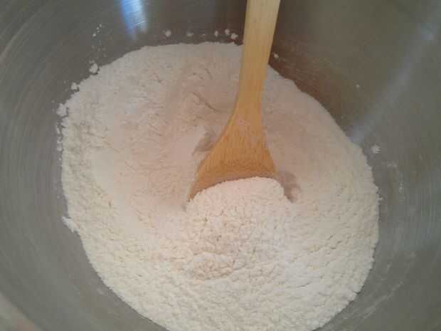 4) en un recipiente aparte, añadir la harina, polvo de hornear y la sal y mezclar bien con una cuchara. Luego, agregar un poco a la vez de esta mezcla seca a la mezcla húmeda. Combinan con suavidad.
