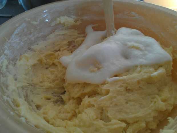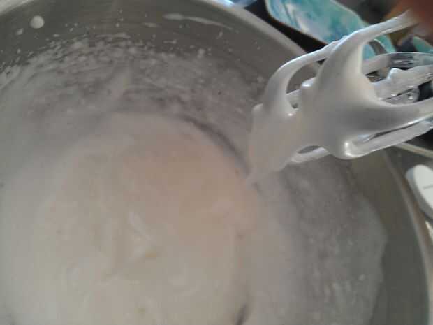 5) batir las claras de huevo y el Crémor Tártaro en un recipiente aparte hasta que las claras de huevos forman picos suaves. Añadir claras de huevo poco a poco en el resto de la mezcla e incorpore suavemente.