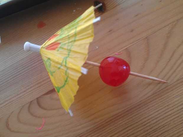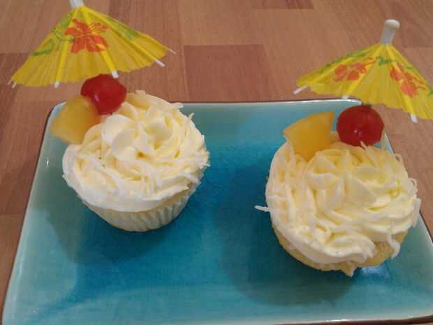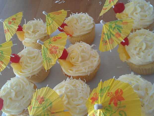 Coloque un pequeño trozo de un anillo de piña en el borde de la Magdalena. Meter el paraguas a través de una cereza al marrasquino. Introduzca suavemente el paraguas con la cereza en la Magdalena al lado de la rebanada de piña. Espolvorear el cupcake con coco rallado.