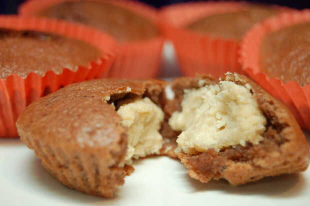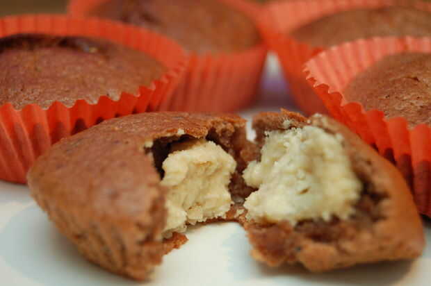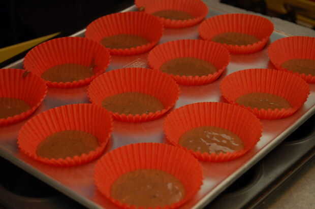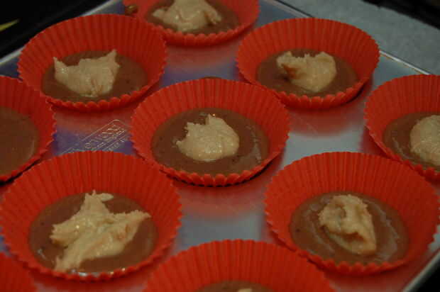 Cuchara en sus casos de Magdalena/muffin hasta 1/3 por completo entonces lugar 1 cucharadita de mantequilla de maní sobre la mezcla. Entonces usted tendrá que agregar más de la mezcla de torta de banana para que cada caso es 2/3 completo.