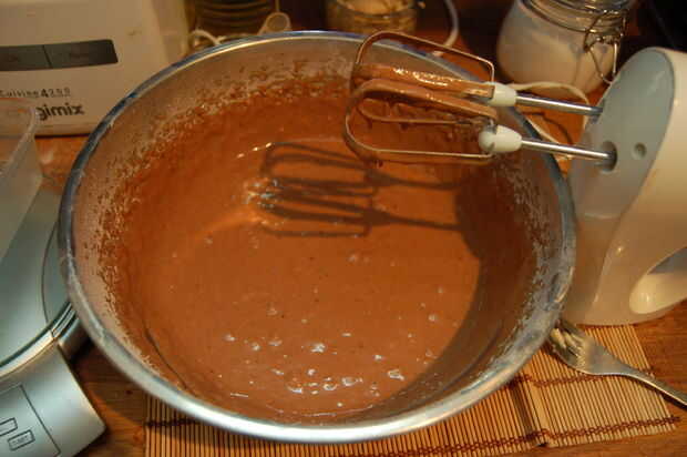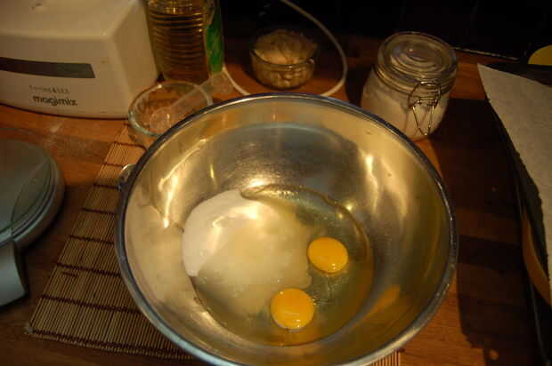 Poner el azúcar, huevos y aceite en un recipiente grande y usar una batidora eléctrica para batirles hasta pálido y ligeramente mayor en volumen. Incorpore los plátanos y los ingredientes secos hasta bien mezclados.