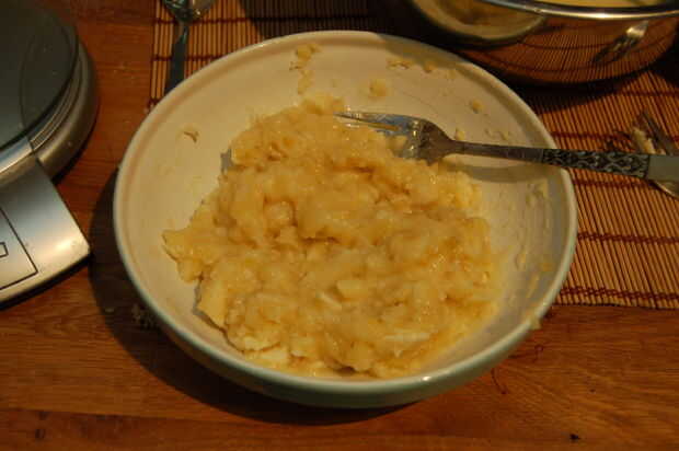 Poner los plátanos pelados en un recipiente y puré hasta que quede suave.