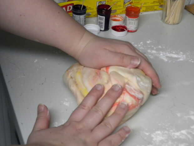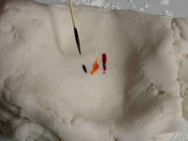 Algunos pasteles a un tono terracota en color. Ello mediante la aplicación de pequeñas cantidades de gel rojo, marrón y amarillo alimento colorante poco a poco, y amasar el fondant hasta que el color ya no es entreverado y alcanza el tono deseado. Usé una olla de barro pequeño para la referencia de color.