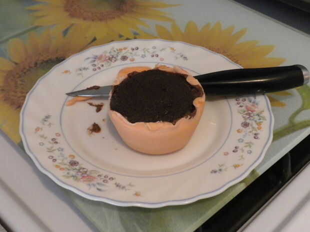 Aplicar una fina capa de chocolate glaseado a la parte inferior y los lados de la Magdalena y cuelgue de un círculo de fondant. Uso limpio y seco, no cubierto en helar los dedos, alise suavemente el fondant sobre el cupcake. Utilice un cuchillo pequeño y afilado para recorte cualquier exceso (fondant). La primera vez que lo hice, tardé un par de intentos para hacerlo bien.