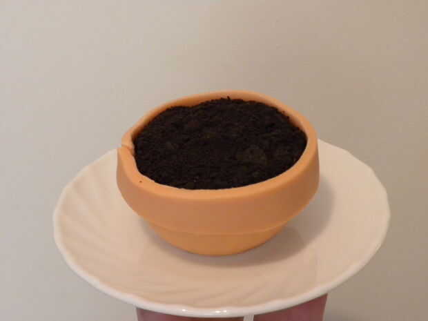 Corte una tira pequeña de terracota (fondant) y, utilizando agua como pegamento, colocar alrededor del borde superior de la maceta. Asegúrese de colocar alto suficiente para que está rodeando el glaseado y migas así.