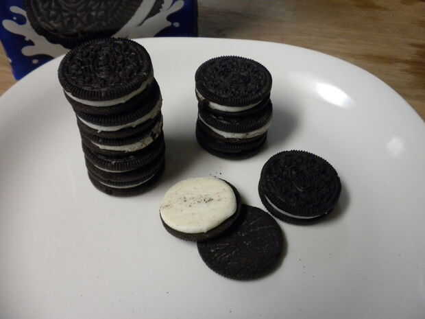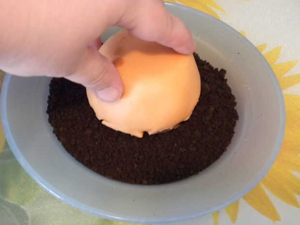 Coloque sus migas de Oreo en un plato bajo y la cima helada de la Magdalena en las migas hasta que estén bien cubiertas.