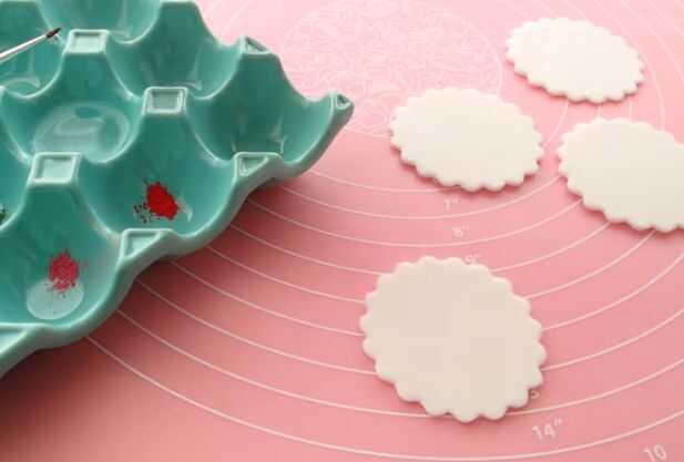 Rollo de algunos (fondant) blanco y con un cortador de galletas de círculo, cortar círculos tantos (la misma cantidad como cupcakes) ya que necesitará y deje que endurezca durante 30 minutos.