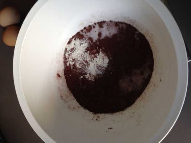 • mientras se derrite la mantequilla y el chocolate, colocar el azúcar flor, polvo de hornear y cacao en polvo en un recipiente grande (cuadro 1)