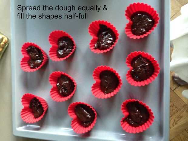 Use una cuchara para distribuir igualmente la masa en cada forma. Como los cupcakes
