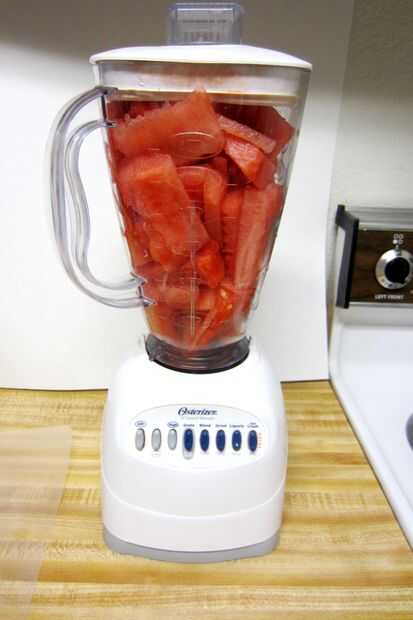 Consejo: Las piezas de los más pequeñas, más fácil su licuadora serán capaces de licuarlo. Realmente me pareció más fácil llenar la licuadora solamente la mitad y mush la sandía abajo con un tenedor primero.