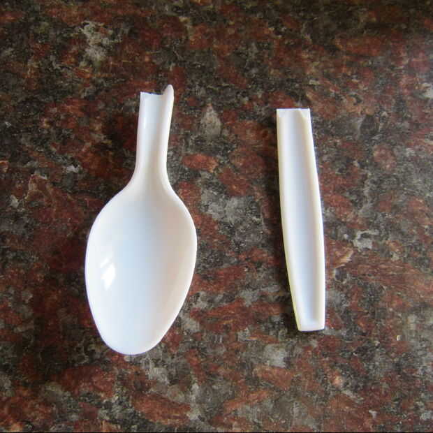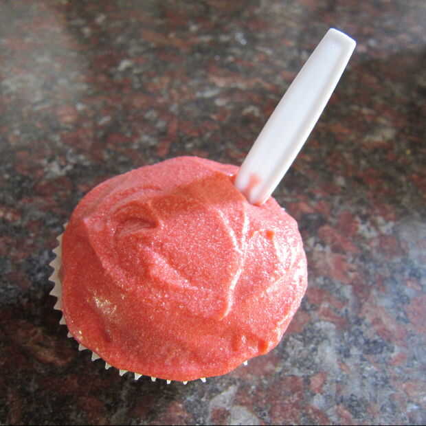 Frost enfría cupcakes. Romper cucharas de plástico por la mitad y pegue el extremo la mitad en el Magdalena para conseguir un efecto de cuchara en el tazón.