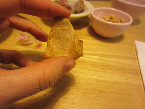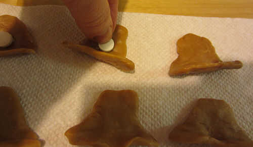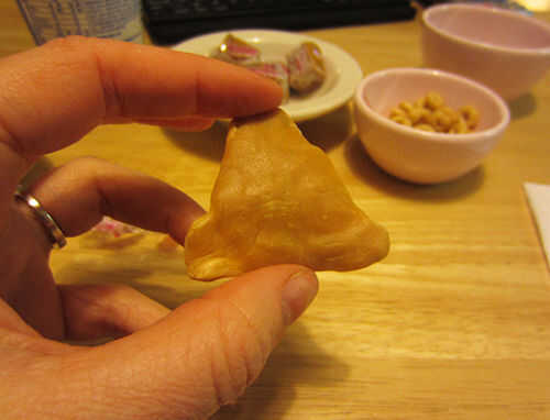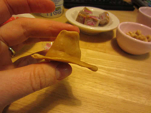 Para crear el sombrero, desenvolver un caramelo y smoosh hacia fuera un poco. Corte o quite los puntos duros en los bordes. Recortar las esquinas de un lado del caramelo para crear un triángulo.